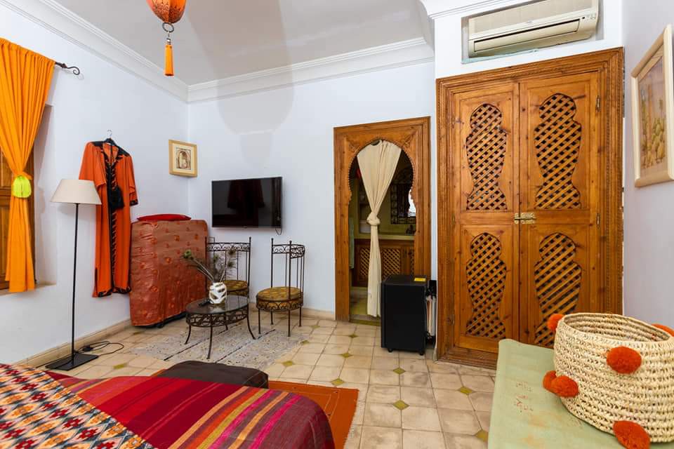 On the first floor, the Orange Blossom room is decorated in shades of aniseed green and orange. Spacious, with 2 80cm beds forming a double bed. In the corner is a small wrought-iron sitting area, a closet and the anise-green taddelak bathroom. The room is suitable for people with reduced mobility.